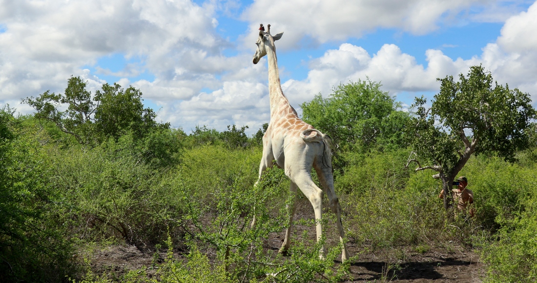 Un raro rasgo genético llamado leucismo le causa el color blanco y hace que el animal destaque en la árida sabana próxima a la frontera con Somalia.