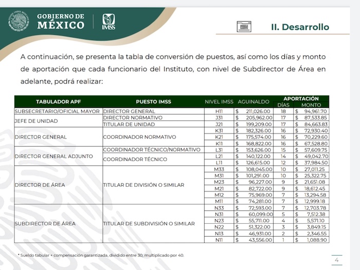 “A continuación, se presenta la tabla de conversión de puestos, así como los días de monto y aportación que cada funcionario del Instituto, con nivel de Subdirector de Área en adelante, podrá realizar: