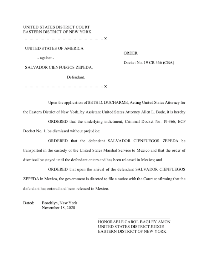 La orden emitida por los fiscales, posterior al análisis de los daños para la relación México-EU, pide que se desestimen los cargos y que, además, tan pronto como ingrese a la Corte, este miércoles, sea liberado y enviado a México.
