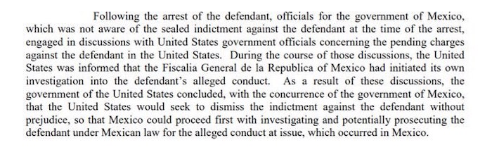 Los fiscales de la Corte de Brooklyn, en Nueva York, admitieron además que las autoridades mexicanas no estaban al tanto del enjuiciamiento del General Cienfuegos y que después de discutir los efectos acordaron desistirse.