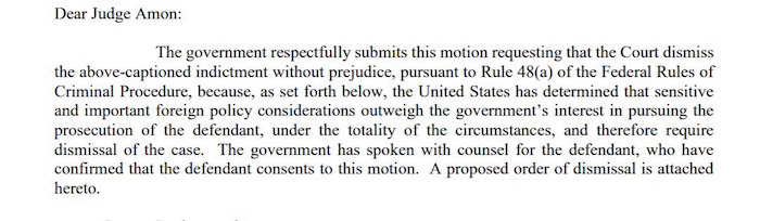 "Estados Unidos ha determinado que las consideraciones sensibles e importantes de política exterior superan el interés del gobierno en perseguir el enjuiciamiento del acusado, bajo la totalidad de las circunstancias, y por lo tanto requieren el sobreseimiento del caso", escribieron los fiscales, que luego pidieron a la Juez Carol Bagley Amon que desestime los cargos contra el extitular de la Defensa Nacional del Gobierno de Enrique Peña Nieto.