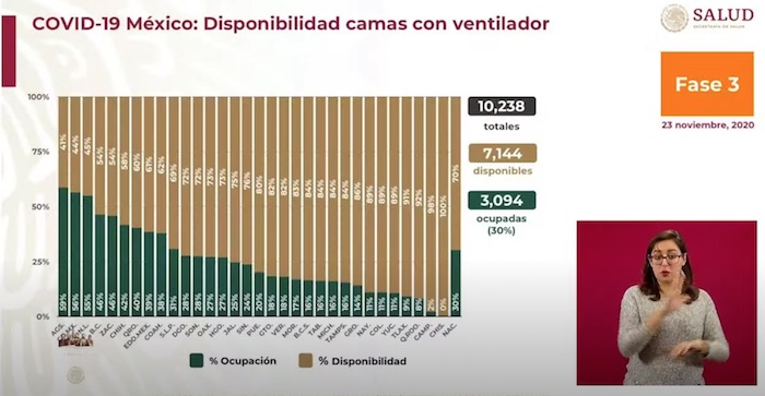 Sobre las camas con ventilador, la media nacional es del 30 por ciento. De los 10 mil 238 espacios disponible,s 3 mil 094 tiene un paciente con apoyo respiratorio.