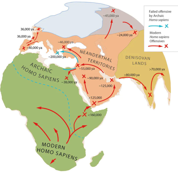 De cualquier manera, los registros arqueológicos confirman lo agresivo de las guerras que emprendían unos y otros por el terreno. De ello hay señales reveladoras, sea en forma de garrotazos en la cabeza o brazos rotos (modalidades con las que intentaban defenderse los neandertales), o de heridas de lanza en el pecho.