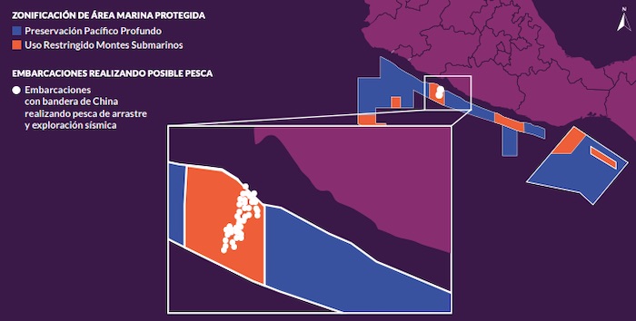 En la Reserva de la Biosfera Pacífico Profundo Mexicano, cuatro de las embarcaciones con bandera China realizaron pesca de arrastre y pesca sísmica, prácticas que tienen un impacto negativo en la biodiversidad por su poca selectividad y afectaciones en las zonas cercanas, por lo que en México está permitida solo para algunas pesquerías y se debe de contar con un permiso de la Comisión Nacional de Pesca y Acuacultura (CONAPESCA). En esta Área Marina Protegida, la más grande del país, los ecosistemas y hábitats únicos permiten la existencia de especies que no se encuentran en otros ambientes, y especies en riesgo como el cachalote común y el delfín moteado.
