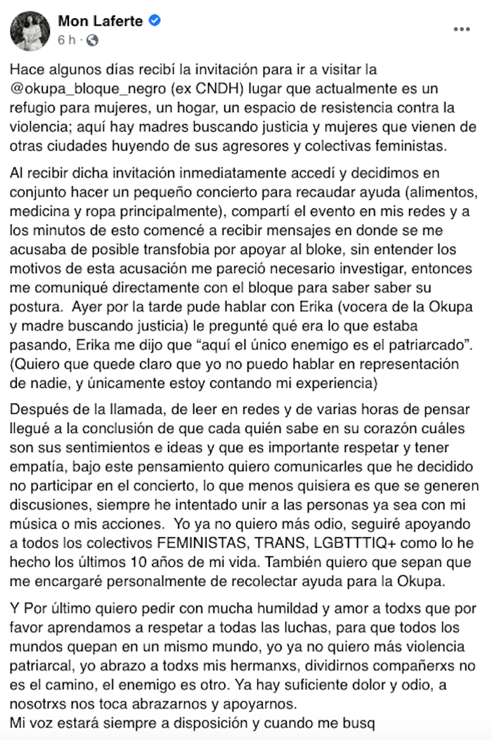 “Quiero comunicarles que he decidido no participar en el concierto, lo que menos quisiera es que se generen discusiones, siempre he intentado unir a las personas ya sea con mi música o mis acciones. Yo ya no quiero más odio, seguiré apoyando a todos los colectivos FEMINISTAS, TRANS, LGBTTTIQ+ como lo he hecho los últimos 10 años de mi vida”.