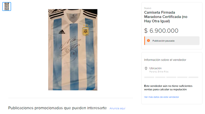 La tercera, otra vez de la Selección Argentina, está en la venta por 6 millones 900 mil pesos argentinos (poco más de 85 mil 300 dólares). Su vendedor escribe que "se entrega con certificado de autenticidad, fotos y video del momento de la firma".