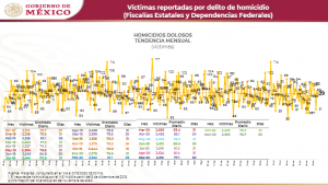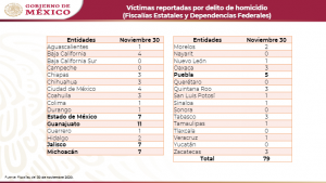 En el informe diario sobre homicidio doloso se detalló que el mes de noviembre registró dos mil 303 asesinatos, es decir, un promedio de 76 al día.