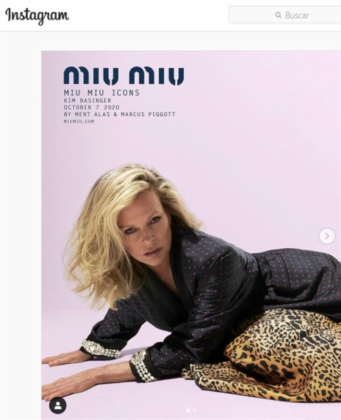 Madrid, 1 de diciembre. (EFE).- La actriz Kim Basinger, a punto de cumplir 67 años el 8 de diciembre, regresa a sus orígenes como modelo para la campaña "Holiday 2020" de la firma de Miuccia Prada, Miu Miu.