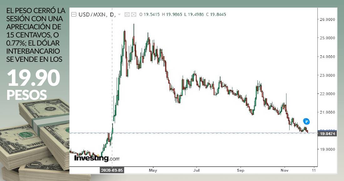 El tipo de cambio alcanzó un mínimo de 19.8790 pesos, nivel no visto desde el 5 de marzo, antes del anuncio de contingencia sanitaria por la COVID-19 en México. El peso cerró la sesión con una apreciación de 0.77 por ciento, o 15 centavos, cotizando en un máximo de 19.9190 pesos por dólar. En ventanillas bancarias de Banorte el dólar se coloca en los 20.10 pesos.