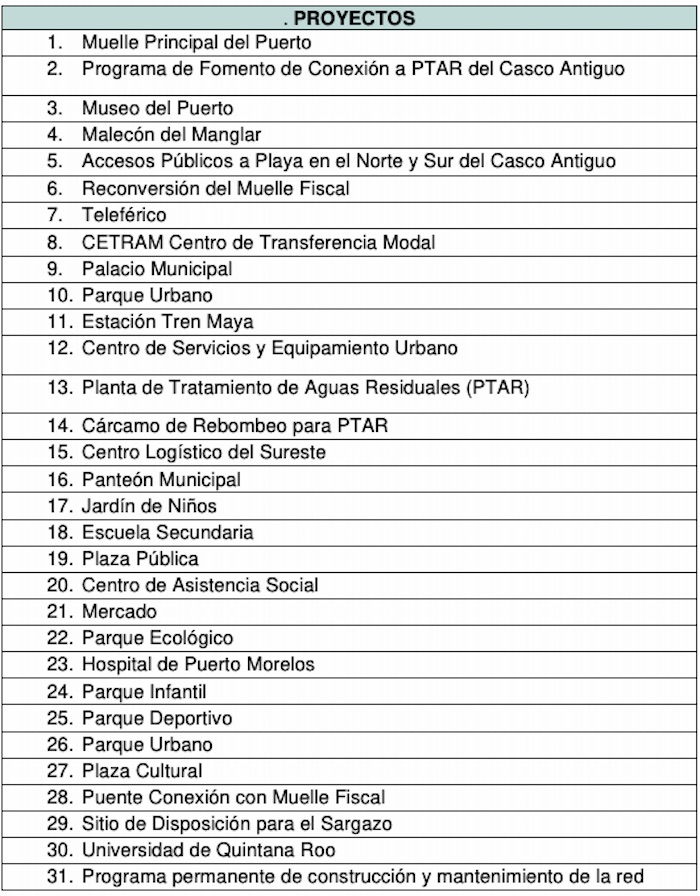 Lista de proyectos para reordenamiento urbano, incluyendo la estación del Tren Maya en el punto 11. Tabla: PDU Puerto Morelos 2020-2030