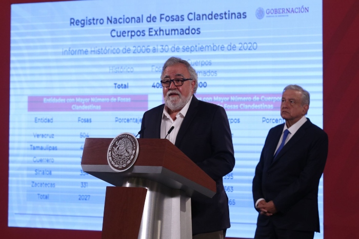El funcionario precisó que desde el 1 de diciembre de 2018 hasta el 24 de noviembre de 2020 se encontraron mil 399 fosas clandestinas, en las que han sido exhumados dos mil 290 cuerpos, de los cuales 879 han sido identificados y 504 han sido entregados a familiares.
