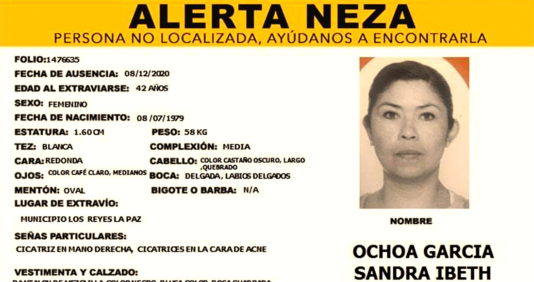 La alerta de búsqueda fue lanzada el 9 de diciembre por la Dirección General de Seguridad Ciudadana de Nezahualcóyotl, luego de que se reportara como desaparecida y se especificara que fue vista por última vez en el municipio de Los Reyes, La Paz, en el mismo estado.
