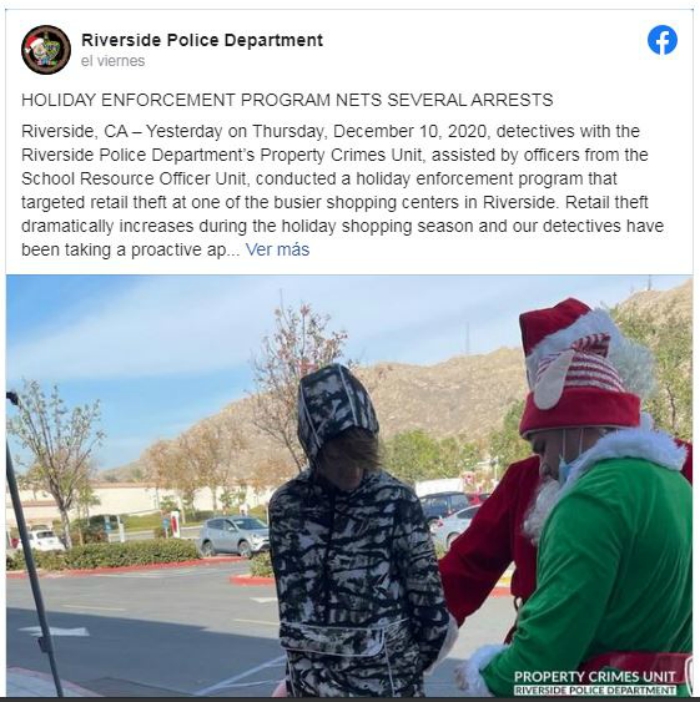 California, 13 de diciembre.- Dos agentes policiales encubiertos que iban vestidos de Santa Claus y de elfo detuvieron el jueves a dos presuntos ladrones de autos junto a un concurrido centro comercial de Riverside (California, EU), informó la Policía local a través de Facebook.