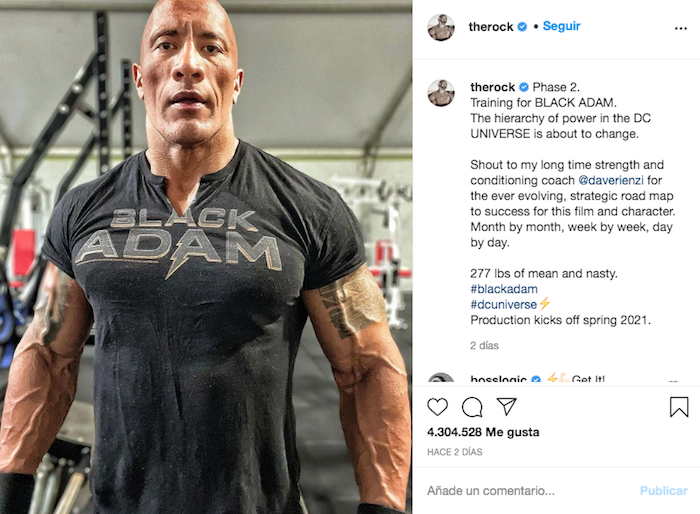 El actor de Jumanji y Fast & Furious ha publicado una foto en la que aparece en un gimnasio vistiendo una camiseta de la película. "Entrenando para Black Adam. La jerarquía de poder está a punto de cambiar", escribió junto a la imagen. El actor asegura que está entrenando "mes a mes, semana a semana, día a día", y que ya pesa "227 libras de pura maldad desagradable".
