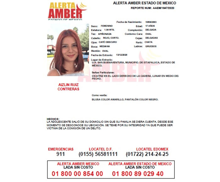 Hasta el momento solo se sabe que la joven de 17 años de edad y de nombre Aizlin Ruiz Contreras desapareció el 12 de diciembre en la Unidad Habitacional San Buenaventura, en el municipio de Ixtapaluca, Estado de México, y al paso de los días su familia desconoce su paradero.