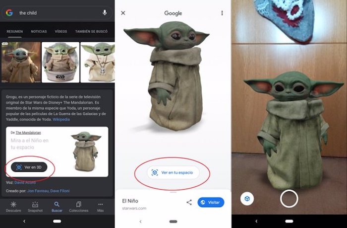 Desde la app de Google en el móvil -o la barra del Buscador-, los usuarios pueden escribir Baby Yoda, The Child o Grogu para encontrar, en los resultados de la búsqueda, un botón 3D que dará vida a este personaje en el entorno real.