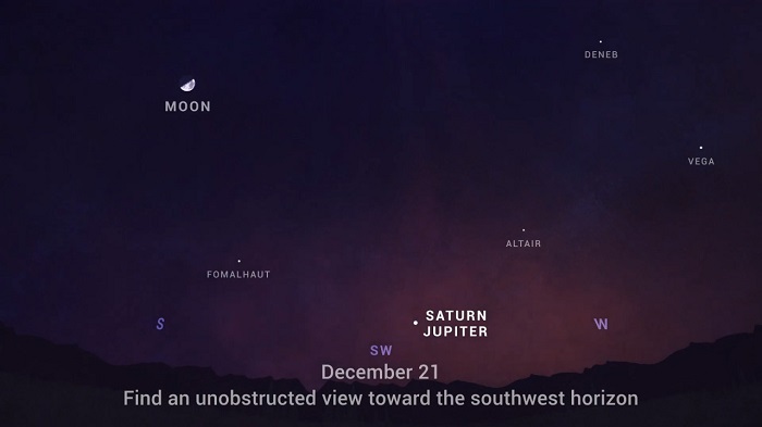Una hora después de la puesta del Sol, habrá que mirar hacia el cielo del suroeste. Júpiter se verá como una estrella brillante y será fácilmente visible. Saturno será un poco más débil y aparecerá un poco arriba y a la izquierda de Júpiter hasta el 21 de Diciembre, cuando Júpiter lo superará e invertirán posiciones en el cielo.
