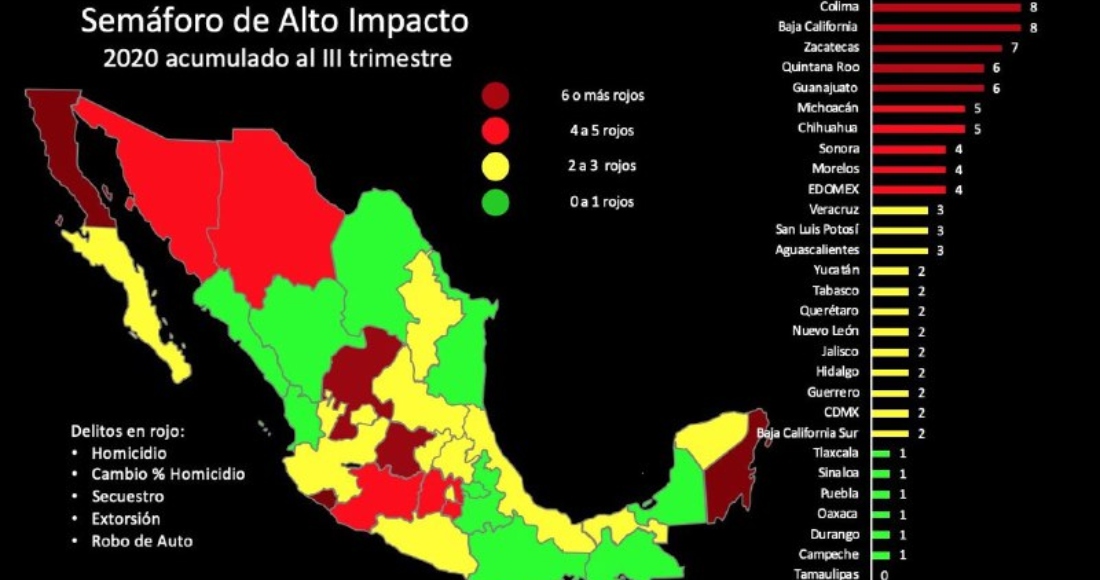 "Tan sólo en octubre pasado, la organización civil Semáforo Delictivo, también reportó que delitos de alto impacto como secuestro, homicidio, robo a negocio y robo de vehículos registraron en Tamaulipas un significativo porcentaje a la baja en los últimos cinco años y en el comparativo anual 2020 con 2019, de acuerdo al Reporte al tercer trimestre", concluyó el informe.