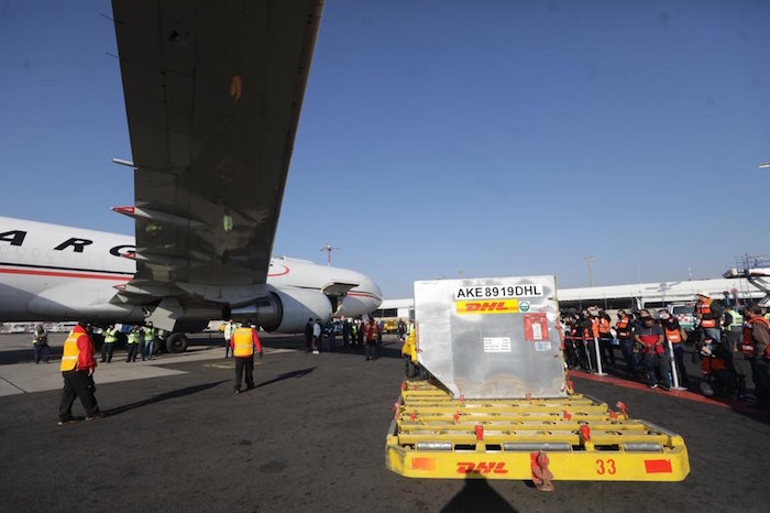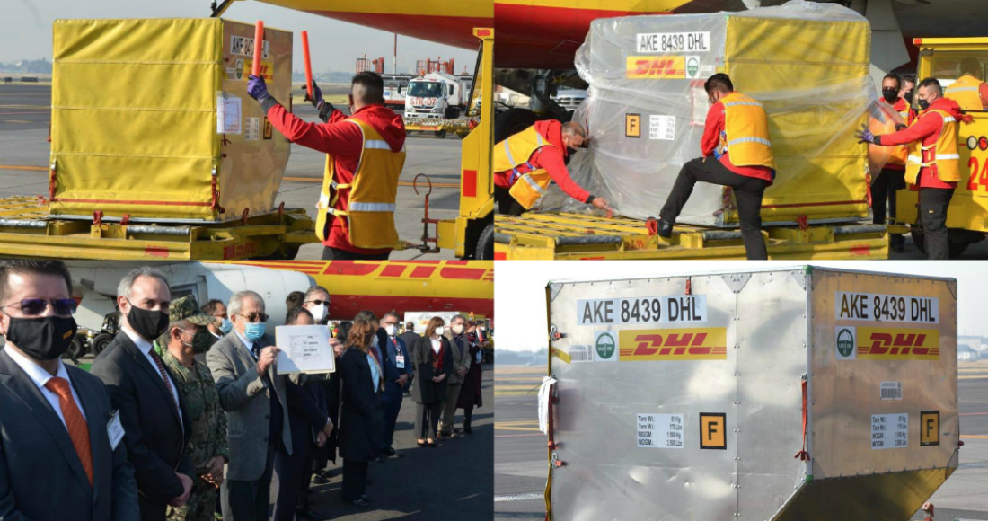 El pasado 23 de diciembre, el primer primer lote de las vacunas contra la COVID-19 que compró el Gobierno de México a las farmacéuticas Pfizer y BioNTech arribó al AICM, a bordo de un avión de la empresa de paquetería DHL.