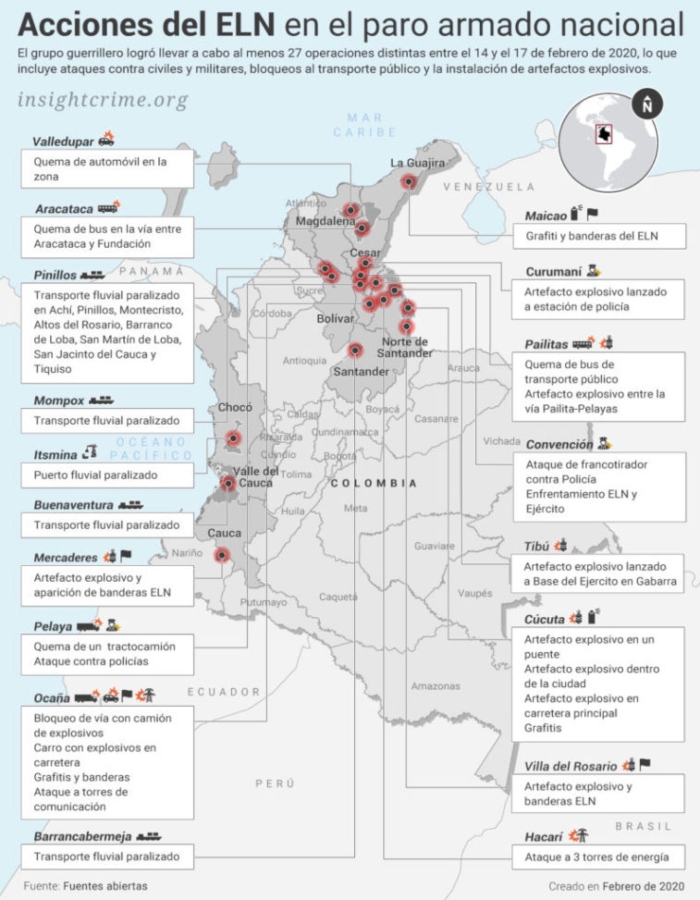 Estas diferentes formas de organizar a sus integrantes se manifestaron en 2020. En febrero, el ELN declaró un “paro armado” a nivel nacional. En al menos 27 operaciones documentadas a finales de febrero, comunidades rurales enteras fueron encerradas mediante toques de queda. La infraestructura eléctrica fue derribada, las carreteras fueron cerradas debido a amenazas de bombas y explosivos, y aparecieron grafitis y banderas pro-ELN por todo el país.