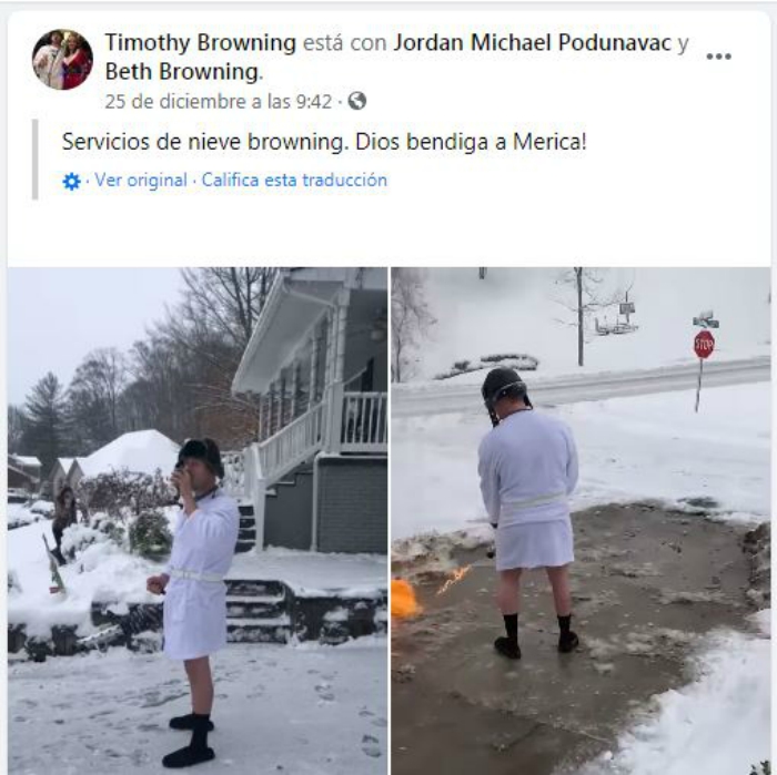 En un video publicado por Jordan Podunavac en Facebook, que se ha hecho viral, se ve cómo Browning despeja con su arma el acceso a la entrada de su casa. El limpiador de nieve incluso "dispara" un par de veces al aire, como celebrando su victoria frente al blanco elemento.