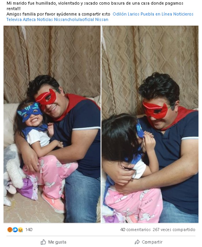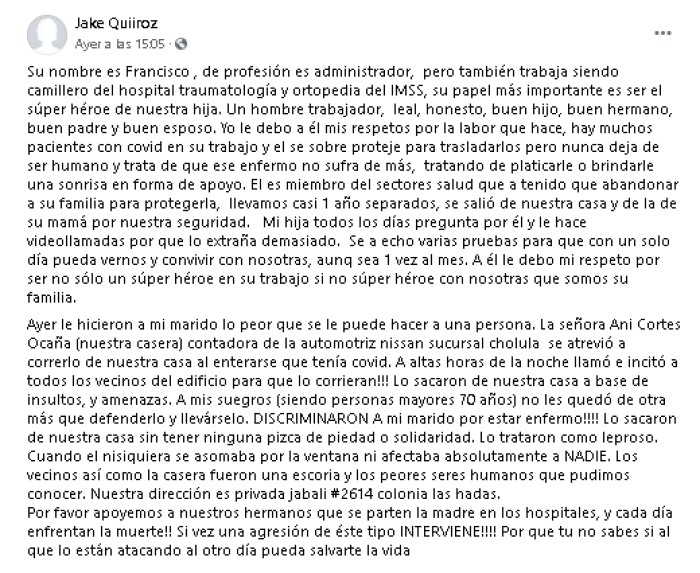 Su esposa dio a conocer el caso a través de Facebook. "Ayer le hicieron a mi marido lo peor que se le puede hacer a una persona. La señora Ani Cortes Ocaña (nuestra casera) contadora de la automotriz Nissan, sucursal Cholula, se atrevió a correrlo de nuestra casa al enterarse que tenía covid".