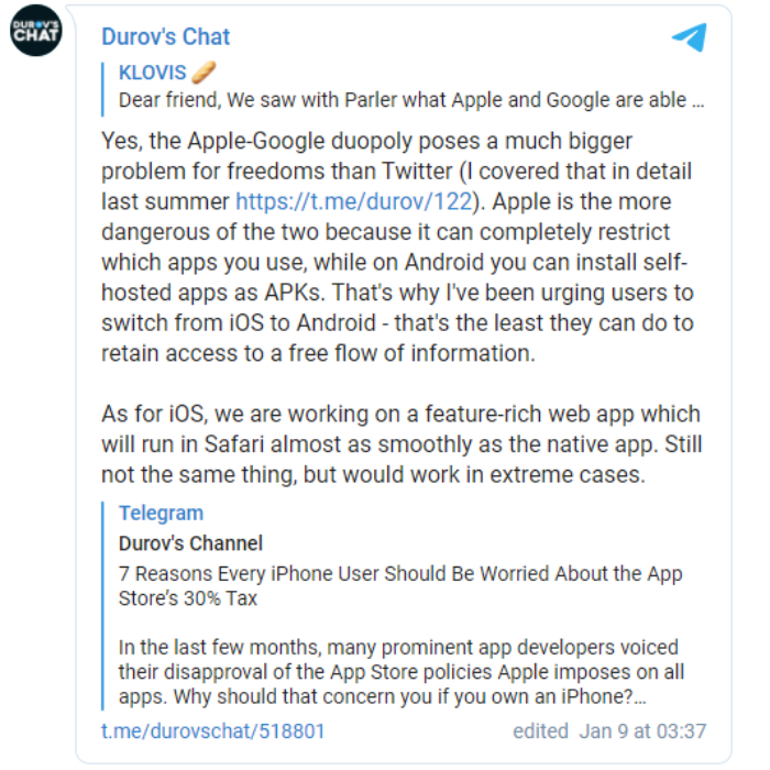 Pável Dúrov, fundador de Telegram, asegura que el duopolio Apple-Google plantea un problema mayor para las libertades que Twitter, pues la empresa de la manzana puede restringir completamente las aplicaciones que usan los usuarios.