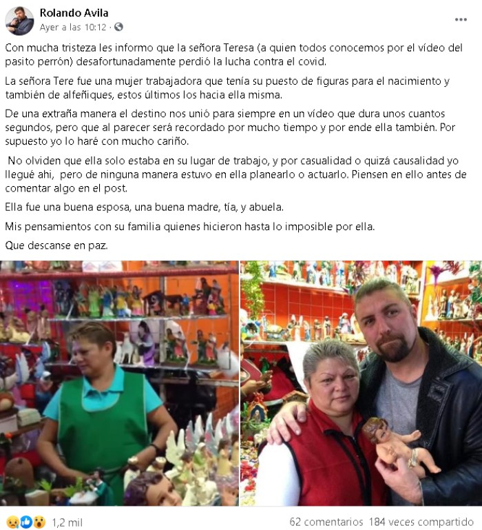 "Con mucha tristeza les informo que la señora Teresa (a quien todos conocemos por el video del pasito perrón) desafortunadamente perdió la lucha contra el COVID", explicó el comediante que en 2015 puso a bailar una figura del Niño Jesús con ese tema musical de fondo.