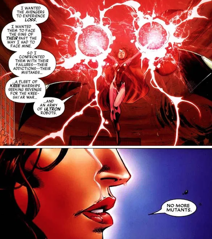 En los cómics, Wanda Maximoff es considerada una de las mutantes más poderosas y peligrosas que existe, si no la más. Sus poderes para alterar, combinar y desdoblar la realidad a su antojo, sumados a sus conocimientos de hechicería, la hacen casi invencible, y en la historia de Marvel eso ha traído serios problemas, incluyendo el arco argumental Dinastía de M, en el que casi se extermina a todos los mutantes. Su frase "No more mutants" es ya historia de las grapas.