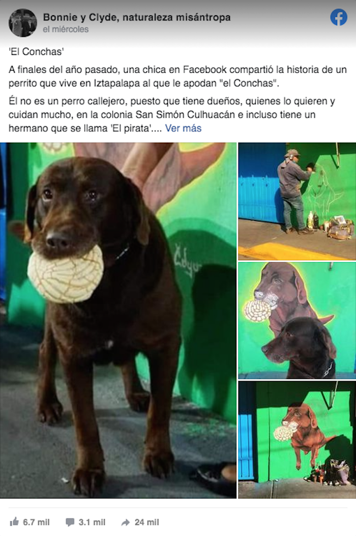 La historia de “El Conchas” se volvió viral a finales del año pasado luego de que Paola Ponce compartiera en Facebook el gusto del can por comer conchas que la gente de la zona le obsequia, y hasta comentó que es quisquilloso, pues cuando alguien le da un bolillo él prefiere llevárselo a su hermano.