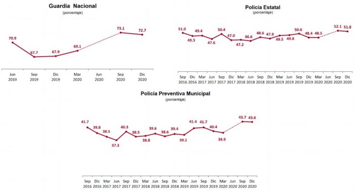 A tasa anual la percepción positiva de las instituciones mejoró, pasando desde el 67.9 por ciento de 2019 para la Guardia Nacional (7.06 por ciento); desde 48.4 para la Policía Estatal (7.02); y desde el 40.4, un avance de 7.92 por ciento.