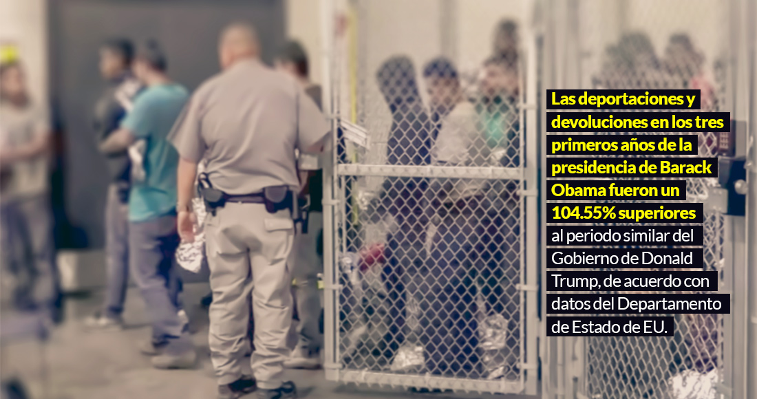 Si se compara la suma de las deportaciones y devoluciones de los tres primeros años en cada administración, el Gobierno de Barack Obama, con 2 millones 529 mil 23 procesos (1 millón 152 mil deportaciones y 1 mil 376 mil devoluciones), reporta un 79.64 por ciento más que las registradas en el periodo de Donald Trump, con 1 millón 407 mil 774 procesos (975 mil 694 deportaciones y 432 mil 80 devoluciones). En tanto que el Gobierno de George W. Bush –con 3 millones 872 mil 073 procesos (562 mil 292 deportaciones y 3 millones 306 mil 781 devoluciones– supera a Trump en un 175.04 por ciento.