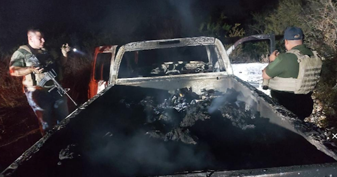 Elementos de la Secretaría de Seguridad Pública fueron alertados por un reporte ciudadano que en una brecha del poblado Santa Anita se encontraban las camionetas incendiadas.