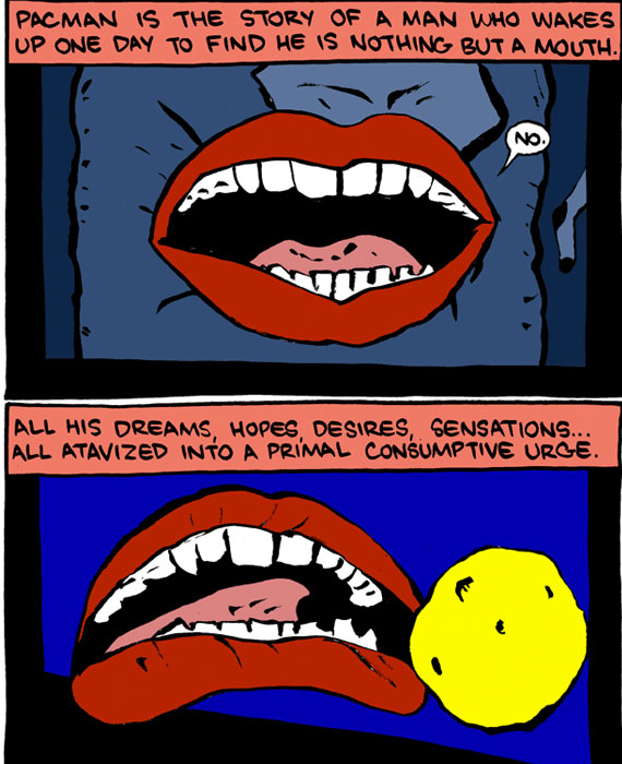 Finalmente, hace unos días la página de webcomic Saturday Morning Breakfast Cereal, proponen una versión un tanto oscura de Pac-Man, con una explicación existencialista que remite a un relato de Franz Kafka en el que se narra la historia de un personaje que un día despierta convertido en una boca invadida por un hambre compulsiva.