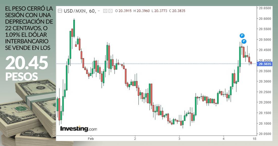 El peso cerró la sesión con una depreciación de 22 centavos, o 1.09 por ciento. El dólar spot se vende en 20.4530 pesos, en tanto que en ventanillas de BBVA se coloca en los 20.57 pesos por cada billete verde. A lo largo de la sesión el tipo de cambio cotizó entre 20.3420 y 20.5000 pesos por dólar.