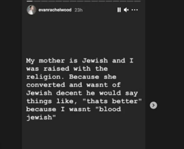 Evan Rachel Wood reveló que Manson dibujó esvásticas en su mesa de luz y hacía comentarios antisemitas hacía ella, incluso, dijo, se burlaba de ella con sus amigos. La protagonista de Westworld, compartió a través de una historia de Instagram que el cantante la llamaba judía de manera despectiva.