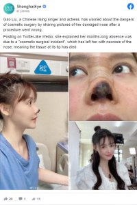 China, 7 de febrero (RT).- Convencida de que un pequeño retoque facial la ayudaría a mejorar su carrera artística, la actriz china Gao Liu decidió someterse a una rinoplastia, pero lo que pensaba que iba a ser un "microajuste" le dejó la punta de la nariz negra por necrosis.