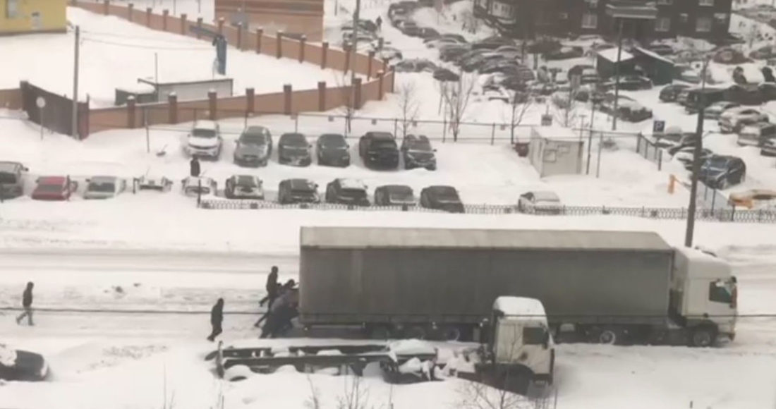 En un video, publicado este sábado por una usuaria de Instagram, se puede ver cómo un grupo de transeúntes ayudó a un camionero, cuyo vehículo quedó atrapado en una carretera cubierta de nieve al sur de la ciudad. Estuvieron empujando el pesado camión hasta que el chófer pudo retomar el control.