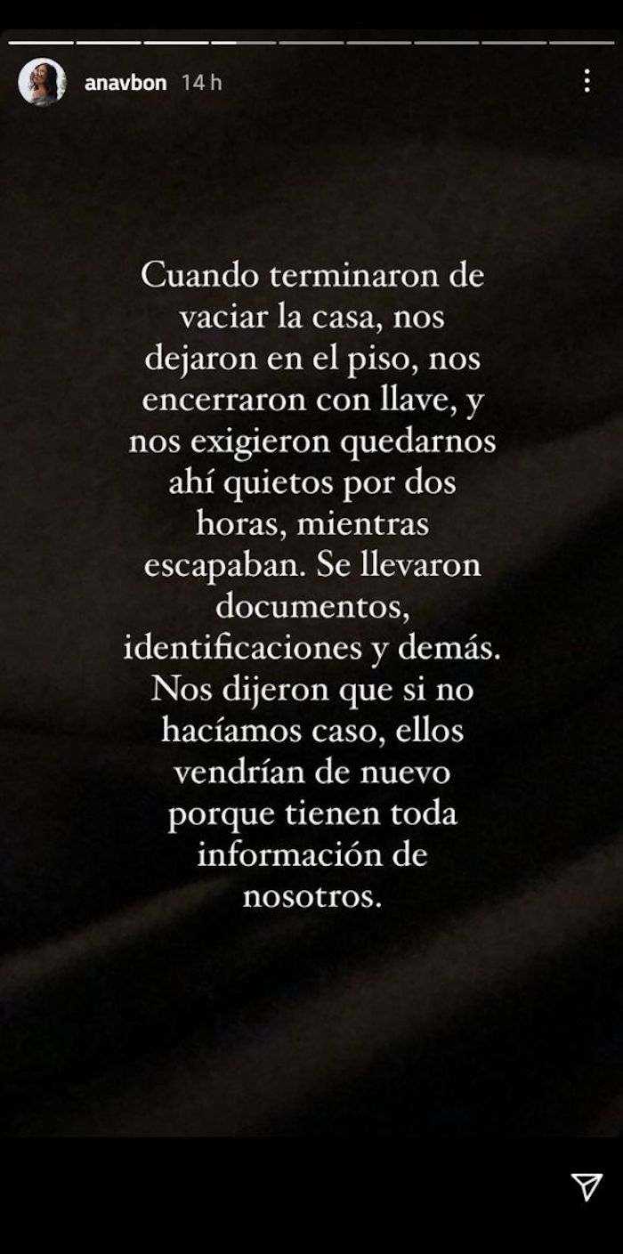 Por último, Ana VBon expresó que pese a lo sucedido tanto ella como su familia se encuentran bien, pero "el terror psicológico que me hicieron pasar aún no lo puedo superar". Asimismo hizo un llamado a su seguidores para que se cuiden.