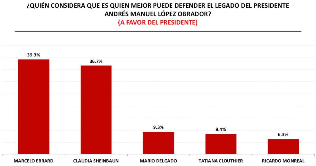 ¿Quién considera que es quien puede defender el legado del Presidente Andrés Manuel López Obrador?, pregunta Massive Caller a dos mil personas. Marcelo Ebrard, Canciller mexicano, aparece en primer lugar con 39.3 por ciento de las respuestas, mientras que Claudia Sheinbaum, Jefa de Gobierno de la capital, tiene 36.7 por ciento.