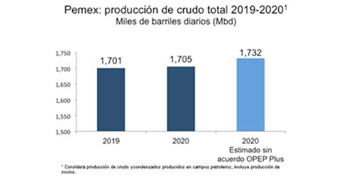 Sin esa reducción inducida de la producción por el acuerdo OPEP Plus, la producción de petróleo de Pemex habría alcanzado un promedio anual de 1 millón 732 mil barriles diarios, lo que habría significado un incremento de 31 mil barriles diarios respecto del promedio de producción diaria del año 2019, expuso.