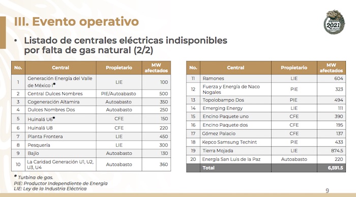 Por la noche se presentaron diferentes fallas a la par que se agravó el problema del frente frío por las bajas temperaturas. Se congeló la infraestructura de generación y se perdieron seis mil 591 megawatts de generación, todo esto a base de gas natural.