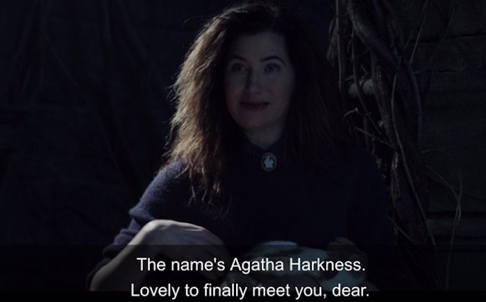 "Wanda Wanda, no pensarías que eres la única chica mágica del pueblo, ¿verdad?", dice Agnes mientras acaricia maquiavélicamente un conejo. "Me llamo Agatha Harkness. Encantada de conocerte por fin querida", añade. Y es entonces cuando, a modo de presentación de su propia serie, se revela cómo la vil bruja ha estado manipulando todo alrededor de la pareja, desde los vecinos al mismísimo Pietro, para que los eventos de la realidad de sitcom creada por Wanda vayan por dónde y ella realmente quería.