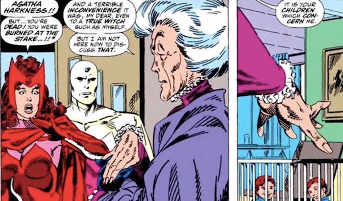 En los cómics, la historia de Agatha Harkness es larga y enrevesada. Creada ni más ni menos que por los míticos Stan Lee y Jack Dirby, la primera aparición de Agatha data de 1970 en el número 94 de Los Cuatro Fantásticos y fue presentada como una de las brujas originales de los juicios de brujas de Salem. Tras ser niñera de Franklin Benjamin Richards, el hijo de Mr. Fantástico y la Mujer Invisible se convierte en mentora de Wanda ayudándola a entender y controlar sus poderes mágicos derivados del gen mutante.