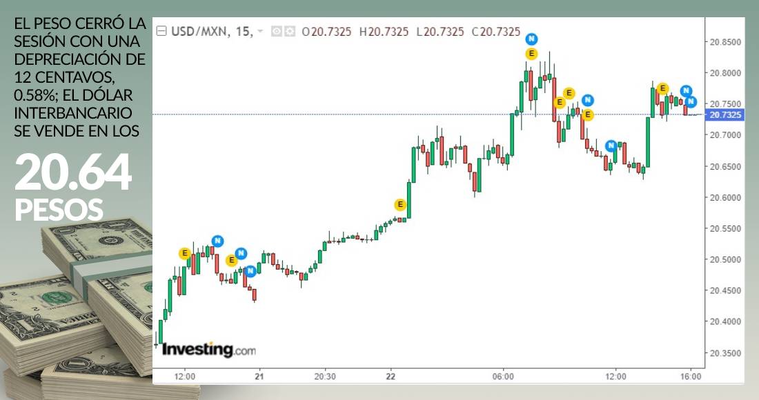 El peso cerró la sesión con una depreciación de 12 centavos, 0.58 por ciento. El dólar spot se vende en 20.6420 pesos, en tanto que en ventanillas de BBVA se coloca en los 21.03 pesos por cada billete verde. A lo largo de la sesión el tipo de cambio cotizó entre 20.6400 y 20.7560 pesos por dólar.