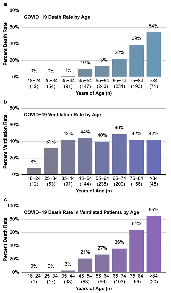 Los investigadores se sorprendieron al comprobar que la edad no era un factor significativo para predecir si un paciente iba a necesitar ventilación mecánica. De hecho, aparte de los pacientes más jóvenes, el porcentaje de pacientes con COVID-19 hospitalizados que requerían ventilación mecánica era similar en cada década de la vida, aunque había una clara correlación entre la edad y el riesgo de muerte intrahospitalaria, con una supervivencia de sólo el 15 por ciento en los pacientes mayores de 84 años que requerían ventilación mecánica.