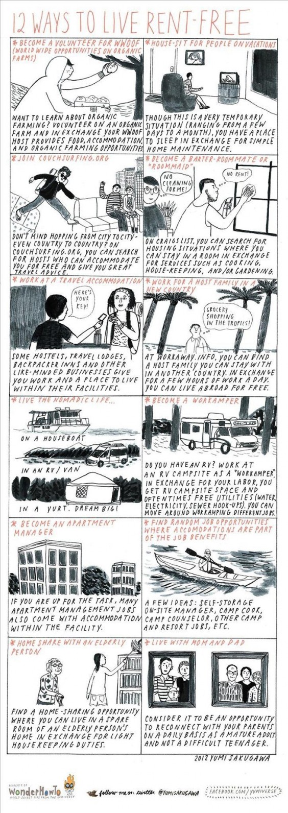 Puedes encontrar gente que pueda desee ofrecerte una habitación para quedarte a cambio de tus servicios para cocinar, mantener la casa limpia, hacer trabajos de jardinería.