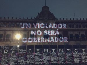 “México feminicida”. “Aborto legal ya”. “Un violador no será Gobernador”. Esos son los mensajes que fueron proyectados sobre Palacio Nacional, donde vive el Presidente Andrés Manuel López Obrador.