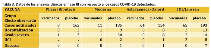 En los ensayos clínicos también se deben analizar aspectos relevantes que dan una idea de otros beneficios de las vacunas. En general, las vacunas deberían reducir el número de personas que se infectan, el número de casos de enfermedad grave, el grado de severidad y la hospitalización y el número de decesos. Un resumen de los datos extraídos de los ensayos clínicos se muestra en la siguiente tabla.