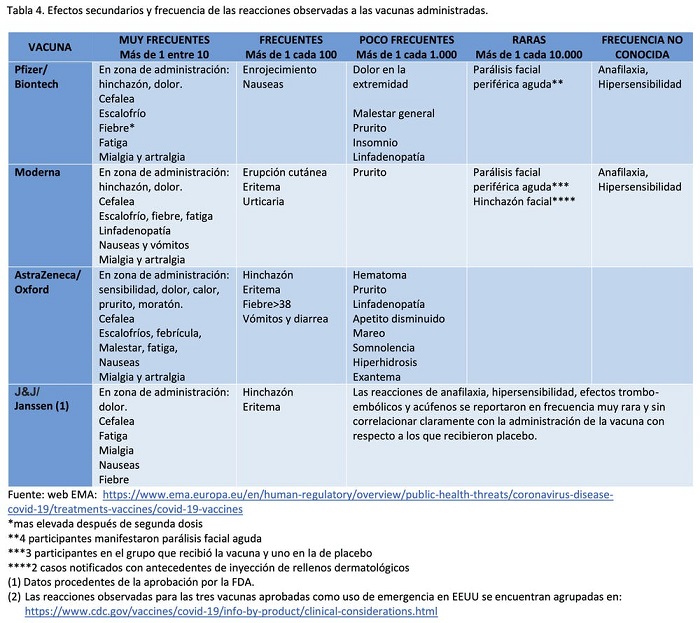En las cuatro vacunas las reacciones adversas notificadas en ensayos clínicos son muy similares y, como veremos, no difieren esencialmente de las observadas para las vacunas que hemos recibido desde que nacimos. Se observan algunas diferencias según la intensidad, que puede ser leve o moderada, pero siempre remiten a los dos días con analgésicos de prescripción habitual. En ninguna vacuna se han observado reacciones de intensidad severa.